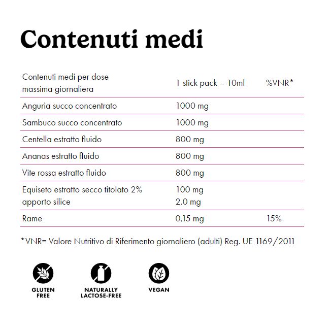 Integratore alimentare a base di estratti di Centella, Ananas, Equiseto e Vite Rossa, succhi concentrati di Anguria e Sambuco e Rame. Centella e Ananas: aiutano ad agire sugli inestetismi della cellulite. Equiseto: favorisce il trofismo del tessuto connettivo. Rame: contribuisce al mantenimento di tessuti connettivi normali. Vite rossa: favorisce la funzionalità del microcircolo e svolge un’azione antiossidante. Sambuco, Anguria, Ananas ed Equiseto: promuovono il drenaggio dei liquidi corporei.