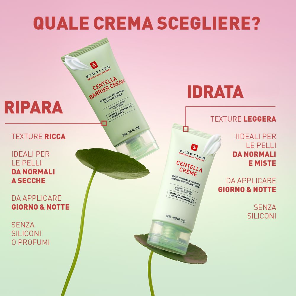 Centella Crème è un concentrato di sollievo immediato che riduce i rossori. La sua formula leggera è arricchita con il 2% di Centella Asiatica, che dona comfort alla pelle, e Acido Ialuronico, che idrata e rimpolpa istantaneamente.