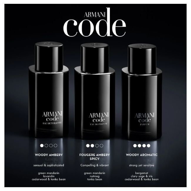 Armani Code Eau de Parfum è l'unione di eleganza e discrezione, un profumo che lascia una scia sensuale dietro chi lo indossa. Per l'uomo Armani Code, la seduzione è un'arte, uno stile di vita, una dominio assoluto di tutti i codici. Armani Code è una fragranza orientale reinterpretata con un twist moderno. Eternamente sensuale, in modo puro e sobrio, unisce eleganza e raffinatezza per l’uomo carismatico e magnetico. Armani Code è una seducente miscela che attinge agli elementi delle tradizionali colonie maschili e aggiunge al profumo contrasti originali. Sensuale e incantevole, questo profumo è un raffinato inno alla seduzione. Un profumo Armani legnoso che esprime armoniosamente la freschezza e la ricchezza olfattiva del fiore d'arancio, sublimato dal bergamotto e dal limone. Le note sensuali del legno di Gaiac e della fava Tonka creano una costruzione olfattiva legnosa e delicata. Queste note durature rappresentano la perfetta padronanza dell'eleganza al maschile. Definiscono tutta la sensualità di questo profumo che è una perfetta combinazione di freschezza e persistenza. Si tratta di una vera e propria firma olfattiva che resta per ore sulla vostra pelle o sui vostri abiti. Il flacone di Armani Code Eau de Toilette rispecchia l'immagine del profumo, discreto e raffinato allo stesso tempo. Moderno ed elegante, il flacone è impreziosito dall'iconica fascia Tuxedo firmata Giorgio Armani. Sofisticato e virile, mette in risalto questo profumo che conferisce una eleganza naturale ed un vero e proprio potere seduttivo. Vaporizzare il profumo sulla pelle o su un abito rispettando la distanza minima di 10 cm. Creare una nuvola di profumo e attraversarla per una profumazione più delicata. Per una profumazione più decisa, applicare il profumo sui punti di pulsazione: collo, nuca, polso, avambraccio e dietro le orecchie.