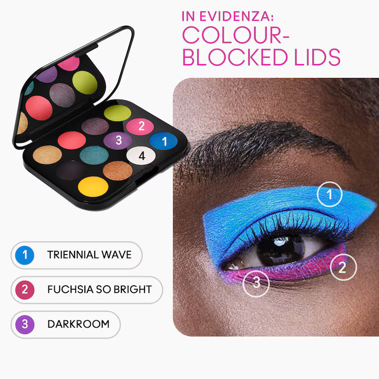 Tonalità audaci: re-energized. Fai un salto in un tripudio di colori con questa palette di 12 ombretti saturi,, di nuova concezione, con una resa dei pigmenti puri in una sola passata per creare* look artistici e mistici senza limiti. Questo spettro stellare di colori neon ipnotici e classici ha una texture leggera e liscia come la seta e una gamma di finish opachi, scintillanti, glitterati e metallizzati. La formula esclusiva, unica nel suo genere, si adatta perfettamente alle palpebre, consentendo un'applicazione, stesura e sfumatura perfette, per un makeup personalizzato. Nuovi ombretti formulati con il 25% in più di pigmenti rispetto alle precedenti palette M·A·C Eye Shadow. Inoltre, questa palette curata dagli Artist ti consente di accedere a un universo online di ispirazioni in continua evoluzione per infiniti look, grazie a un codice QR scansionabile**.