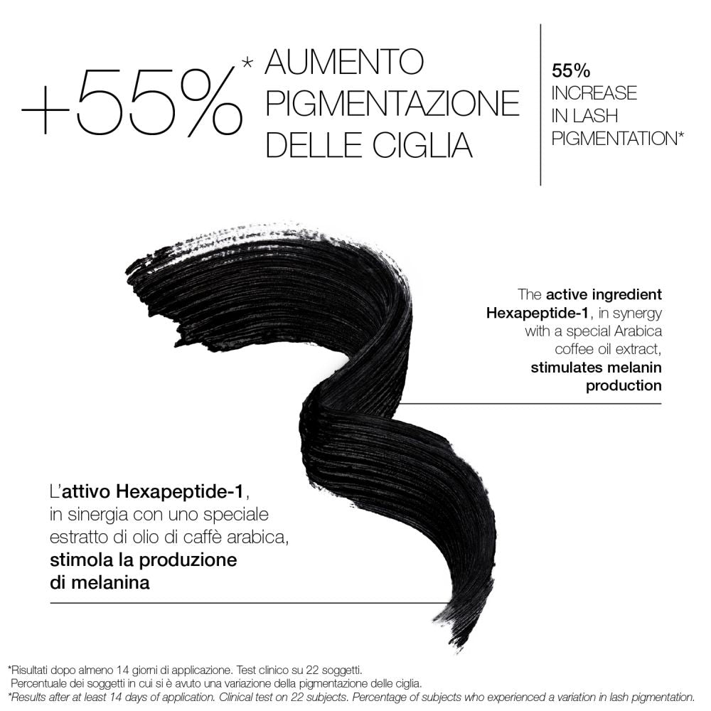 L’attivo Hexapeptide-1, in sinergia con uno speciale estratto di olio di caffè arabica, stimola la produzione di melanina (la melanina è il pigmento responsabile del colore più scuro del pelo), preservando ed intensificando progressivamente la pigmentazione delle ciglia.