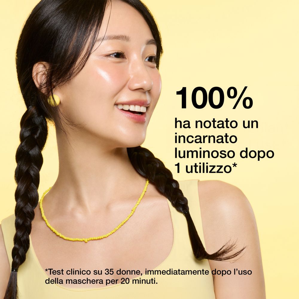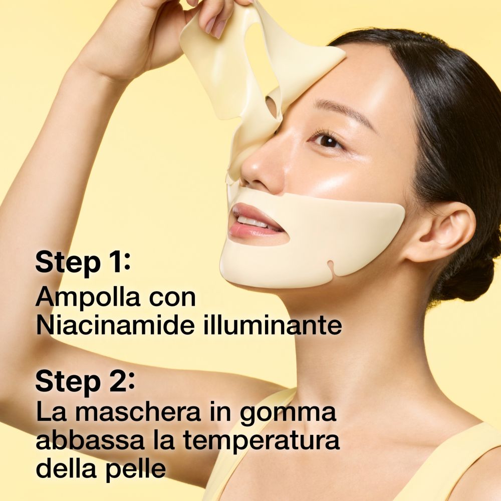 Una maschera in gomma che rinfresca immediatamente la pelle e un’ampolla concentrata dalla texture simile a un siero, con Niacinamide dall’azione illuminante e Peptidi.