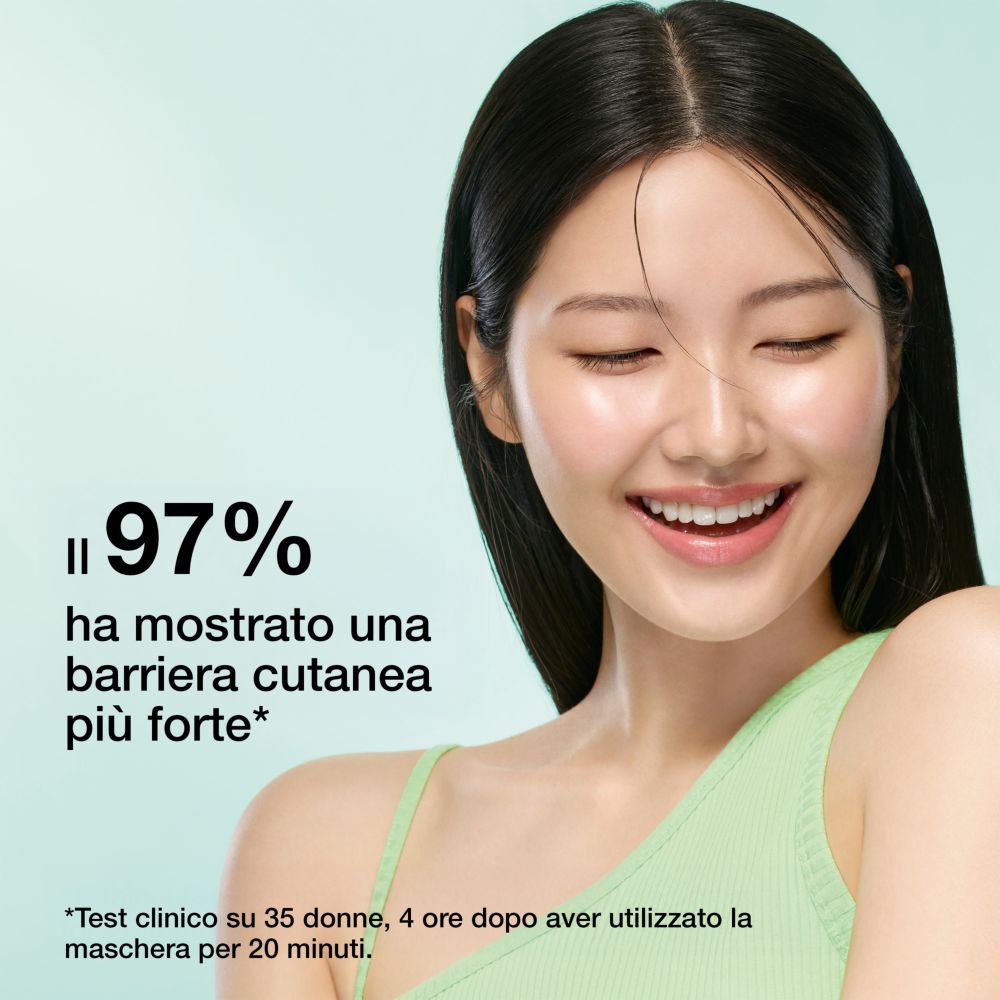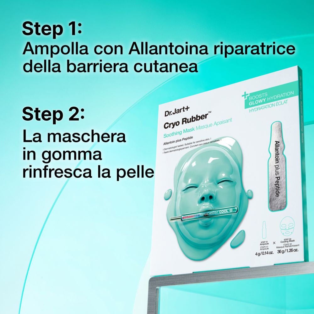 Una maschera in gomma che rinfresca immediatamente la pelle e un’ampolla dalla texture siero con Allantoina per riparare la barriera cutanea e Peptide.