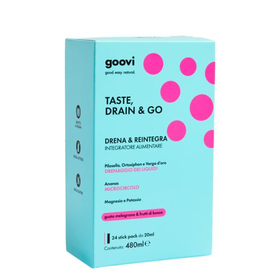 Integratore alimentare drenante in pratici stick pack monouso da portare sempre con te che, grazie alla sua formulazione a base di estratti vegetali tra cui Ananas, Pilosella, Ortosiphon e Verga d’oro favorisce il drenaggio dei liquidi e il microcircolo. Inoltre, grazie alla presenza di Magnesio e Potassio aiuta a reintegrare i sali minerali. Gusto melograno & frutti di bosco. Provalo anche ai gusti zenzero & lime e cranberry & mandarino.