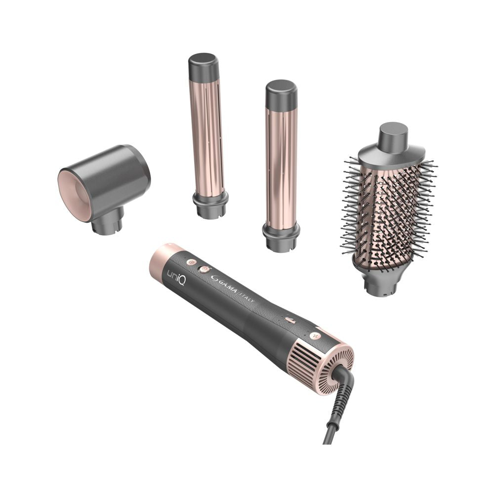 Gama Phon Multistyler UniQ Aura 4 in 1 è un tool professionale, compatto e leggero, con motore Brushless 1500W. Il kit include 4 accessori intercambiabili: 2 arricciacapelli Coanda (ricci senza calore estremo), asciugacapelli e spazzola ovale (liscia e volumizza). Offre 3 temperature, 3 velocità e colpo d'aria fredda per uno styling versatile e veloce.