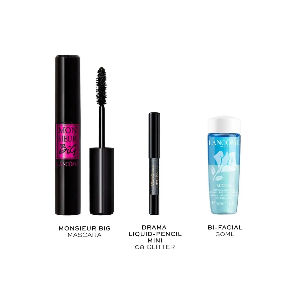 Crea il tuo look occhi più accattivante e audace con il cofanetto regalo Monsieur Big Routine. Dì addio a ciglia finte ed extension grazie al nostro mascara Monsieur Big. La formula a lunga tenuta è anti-sbavature, senza grumi e non si sfalda, donando pigmenti ultra-neri ad alta intensità ad ogni passata. Per uno sguardo ancora più intenso e definito con precisione, perfeziona il tuo eye statement con il Drama Liqui-Pencil e scopri un colore ultra-pigmentato con una sola applicazione. Lo struccante Bi-Facil rimuove senza sforzo anche il trucco più drammatico e waterproof, lasciando la pelle perfettamente pulita e fresca, senza residui untuosi.