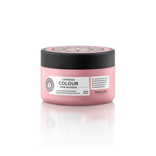 Maschera delicata per capelli colorati che idrata e nutre per un risultato liscio e setoso. Gli ingredienti chiave della linea Maria Nila Luminous Colour sono l'estratto di melagrano e il Colour Guard Complex, che proteggono i capelli e ritardano lo sbiadimento del colore causato da lavaggi, uso di ferri caldi, raggi UV e radicali liberi. La linea Luminous Colour è caratterizzata da una profumazione fruttata, con note di mirtillo e pesca.