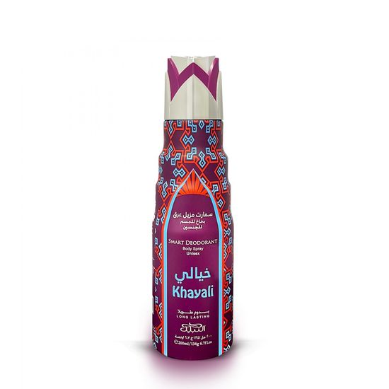 Khayali Nabeel smart deodorant, deodorante unisex da 200 ml. Khayali Smart Deo è felicità, libertà e voglia di viaggiare combinati in un deodorante che ti prende per mano e attraversa cortili bagnati dal sole con stuzzicante patchouli. Questa fragranza possiede una purezza senza pari, inestimabile oltre ogni descrizione.