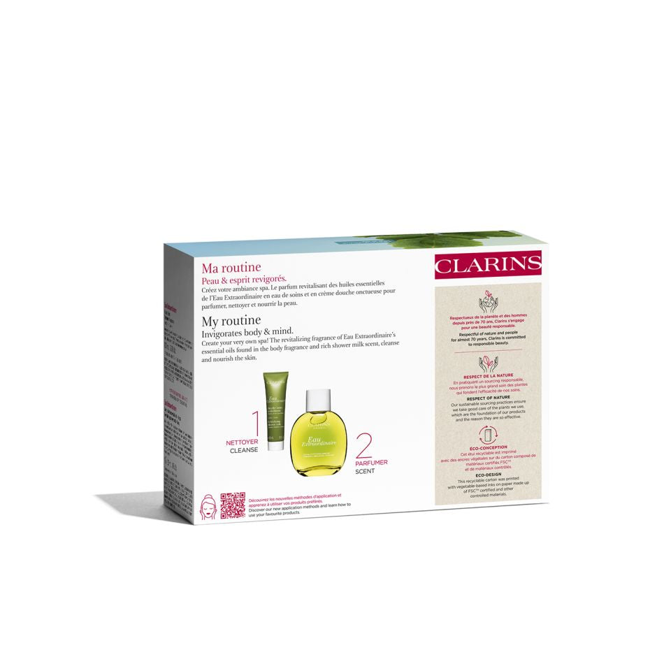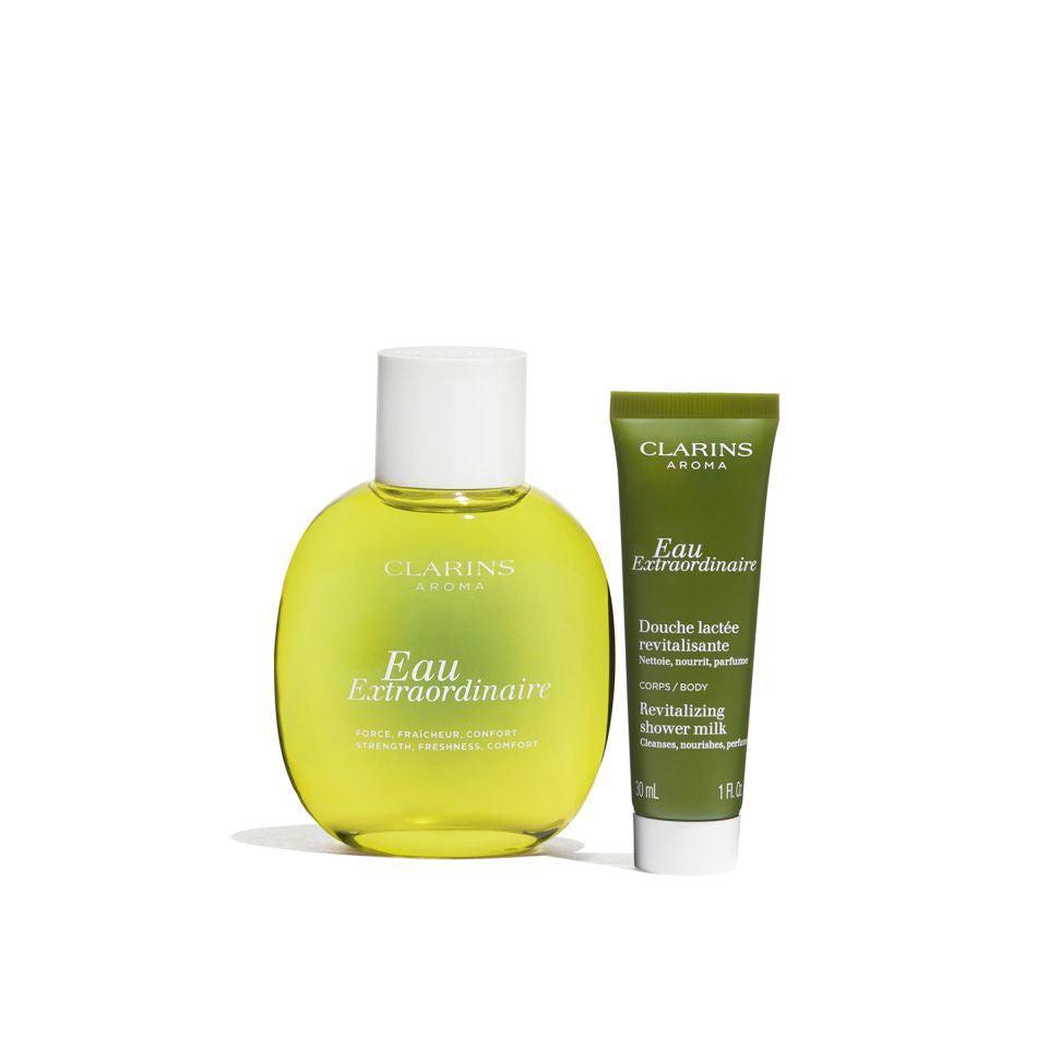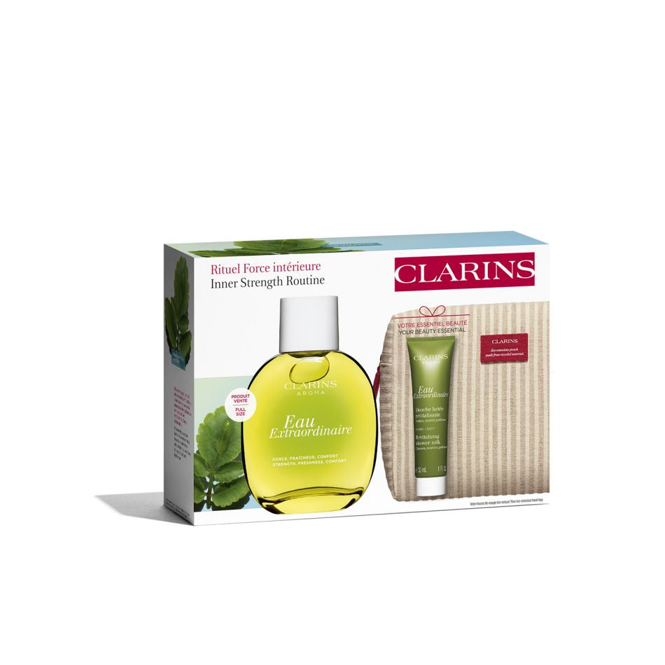 Questo cofanetto riunisce in una trousse in cotone riciclato e tela di iuta l’Eau Extraordinaire, la nuova Acqua di Trattamento Clarins e una crema doccia vellutata arricchita con estratto di mandorla dolce bio, per nutrire la pelle. Questo rituale Force intérieure profuma, deterge, ravviva la forza interiore e risveglia i sensi per una pelle che ritrova tutto il suo comfort. La loro fragranza floreale e fruttata ti trasporta nel cuore dell’universo vegetale di Clarins, invitando a riconnettersi con sé stessi.