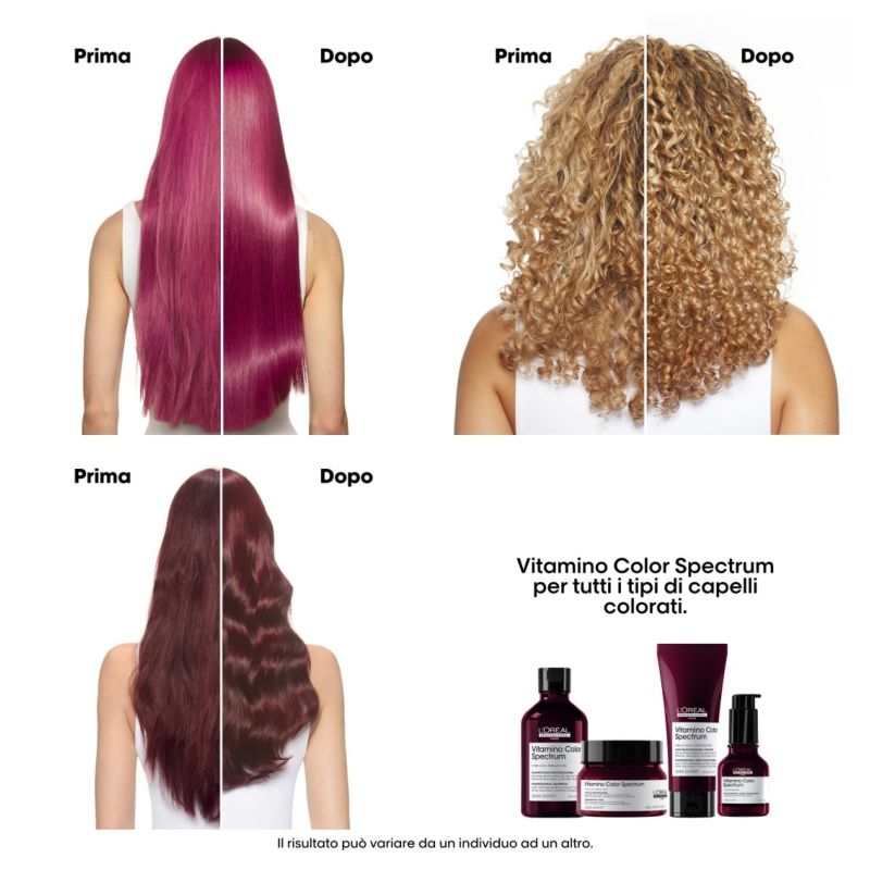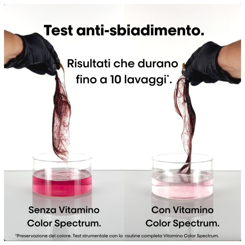 La maschera ha una texture ricca e cremosa che si distribuisce uniformemente sui capelli per idratare intensamente la fibra capillare, per capelli più forti e morbidi. *Test strumentale con la routine completa Vitamino Color Spectrum. **Test strumentale con la routine completa Vitamino Color Spectrum dopo 4 settimane.