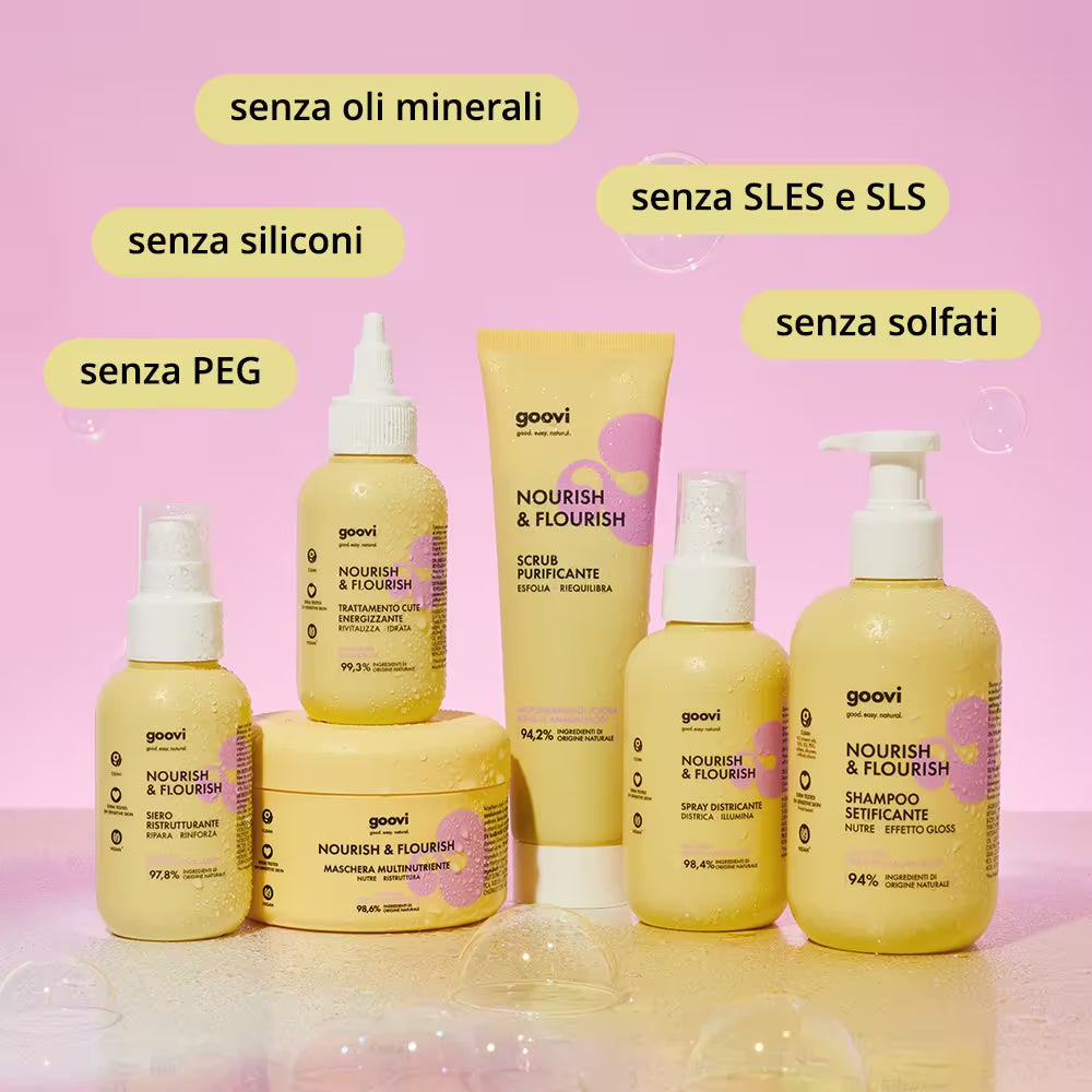 Shampoo nutriente ad effetto gloss con il 94% di ingredienti di origine naturale, deterge delicatamente rispettando il capello.