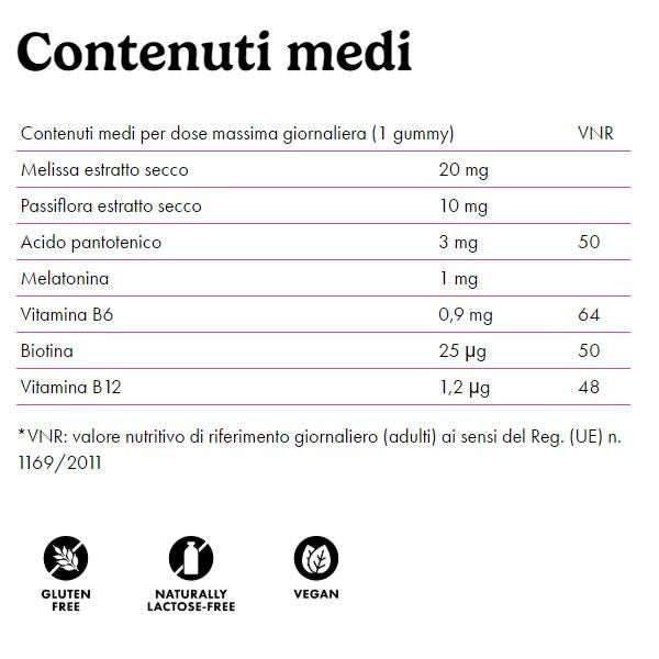 Fructo-oligosaccaridi (FOS); acqua; gelificante: pectina; acidificante: acido citrico; Melissa (Melissa officinalis L.) foglie e.s.; Passiflora (Passiflora incarnata L.) parti aeree e.s.; correttore di acidità: citrato trisodico; olio di cocco; aroma naturale; colorante: antociani; spirulina polvere; D-pantotenato di Calcio cloridrato Piridossina (Vitamina B6); Melatonina; maltodestrine da mais; agente antiagglomerante: cera carnauba; Cianocobalammina (Vitamina B12); D-Biotina (Biotina).