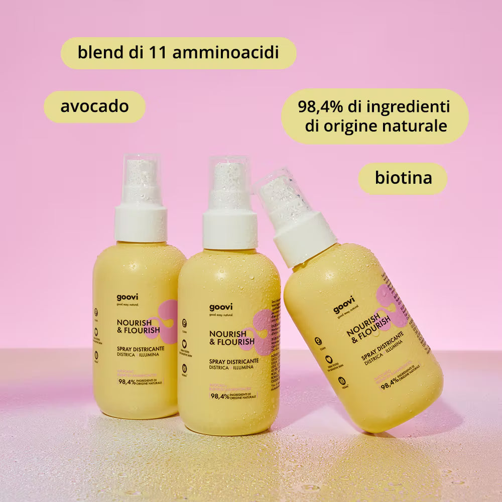 Spray districante con 98,4% da ingredienti di origine naturale, migliora la pettinabilità senza appesantire i capelli, dona lucentezza e lasciandoli morbidi e profumati. La sua formula è priva di siliconi e composta ed è arricchita con Avocado, Biotina e un blend di 11 amminoacidi, che contribuiscono a rinforzare, rigenerare e riparare la fibra capillare. Inoltre, contiene emollienti leggeri ideali per capelli senza nodi. La sua delicata profumazione fiorita e fruttata rende l’applicazione ancora più piacevole.