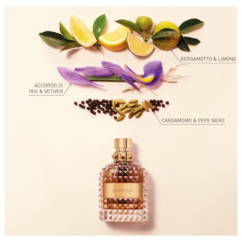 Una fragranza profondamente romana, realizzata con ingredienti della migliore qualità, selezionati con cura. Una miscela delicatamente affumicata, creata grazie all'eleganza legnosa delle essenze di cedro e vetiver. Il tutto viene controbilanciato dalla sensualità orientale dell'accordo di vaniglia e iris, che dona un carattere inaspettatamente forte. Autocelebrazione di un'eleganza maschile tipicamente romana. La bottiglia è caratterizzata dall'inconfondibile borchia Valentino ispirata all'architettura di Roma, simbolo di Valentino Couture. Bergamotto e cardamomo; Lavanda e Pepe Nero; Legno di cedro e Vetiver, Iris